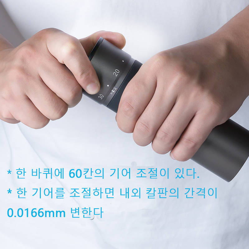 The grinders look like twins, they shared the same weight of 600+g, the same exterior adjustment design where 60 clicks per round, the same hopper volume of 30~35g, the shape of the conical ball.